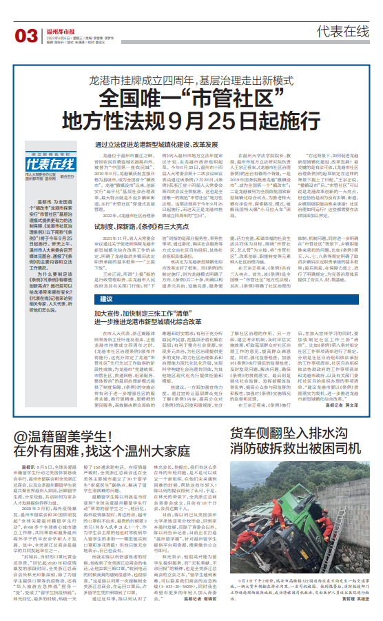 2022年,《龙港市社区治理条例》列入温州市地方立法年度审议计划,由龙港市政府组织起草。今年6月29日,温州市十四届人大常委会第十二次会议审议表决通过该条例;7月28日,《条例》获浙江省十四届人大常委会第四次会议全票批准。这也是全国唯一的规范“市管社区”地方性法规。这部法规将于今年9月25日起施行,而这天正是龙港市挂牌成立四周年的“生日”。