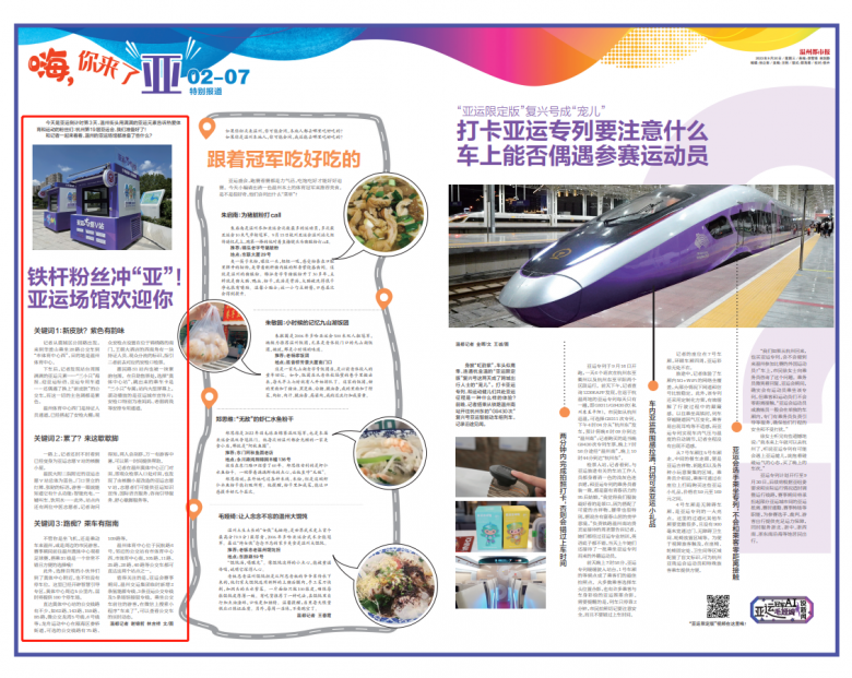 下车后,记者发现站台上满满的“亚运”——三小只海报、迎亚运标语、亚运专用车道……还顺便“偶遇”了换上“新皮肤”的公交车,而这一切的主色调都是紫色。