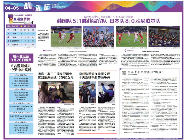 9月25日,温在鼎和队友在帆船项目男子49er级快速艇比赛中暂居第二位,26日下午进行决赛;董文局和队友在帆船项目混合470级双人艇比赛暂列第三位,26日上午进行决赛。