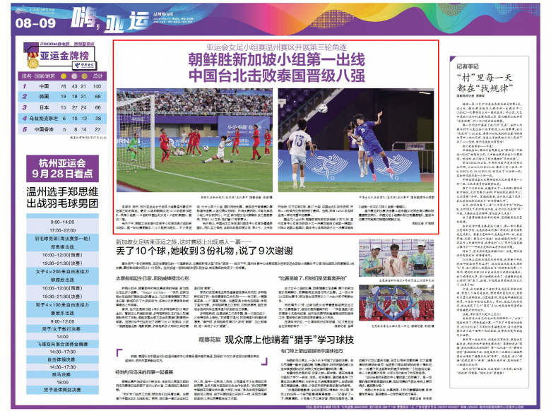 温都讯 9月27日,杭州亚运会女子足球小组赛温州赛区开始第三轮的角逐。最终,C组的朝鲜女足10:0战胜新加坡队,获得小组第一;B组的中国台北女足1:0击败泰国队,晋级八强。