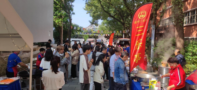 市集现场还吸引了“三乐亭”义工们。热气腾腾的鱼圆汤、松糕、猪油膏等温州小吃,现炒现做,大批市民闻香而来。