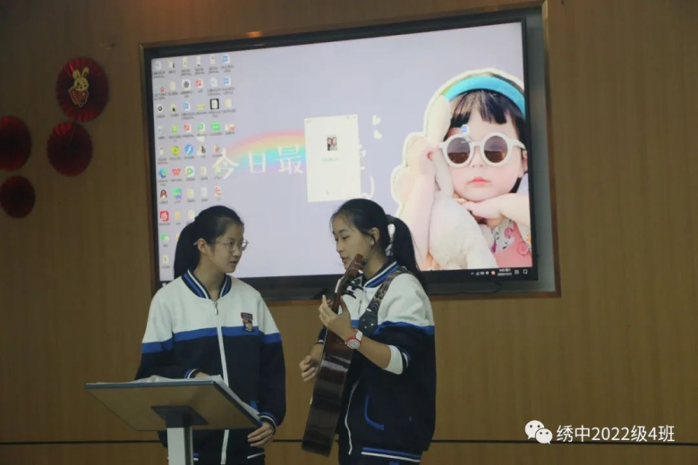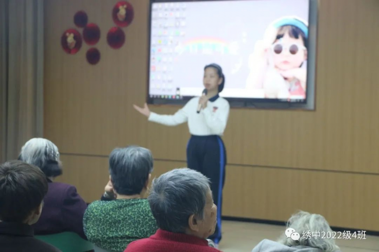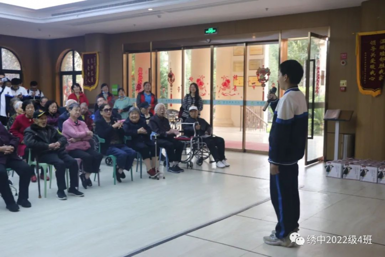 接下来就到了我们班同学们为爷爷奶奶带来表演的时间了!首先是戚雅言和吴至涵两位同学带来的吉他弹唱。雅言弹吉他时自信流利,扫弦潇洒无比;至涵歌声悦耳柔和,又十分洪亮,两人搭配绝佳默契,带来完美的开场。再是徐明朗同学展示他最拿手的魔术表演,他还与台下的爷爷奶奶有互动,问是要变1块钱还是5毛钱,检查一下道具杯子有无蹊跷,倒是很有魔术师的范儿。严紫欣、任佳慧、卓昱萱三位女生的啦啦操紧跟其后,三人配合默契,动作整齐流畅,展现出了超强的柔韧性,同样带来了精彩的表演。邓锦润、李帅迪、夏伟诚、吴则澄四位男生的舞蹈也随之登场,虽不是专业的,但他们随着伴奏起舞的样子为全场带来了欢乐。再是由董展铭和程鑫浩两位同学带来温州童谣 ,可以看出是精心准备过的,很有节奏感,爷爷奶奶们都为其打起了节拍 。压轴的是黄心画同学的诗朗诵,声情并茂,抑扬顿挫,铿锵有力,彰显了饱满的精神与一腔爱国热血。