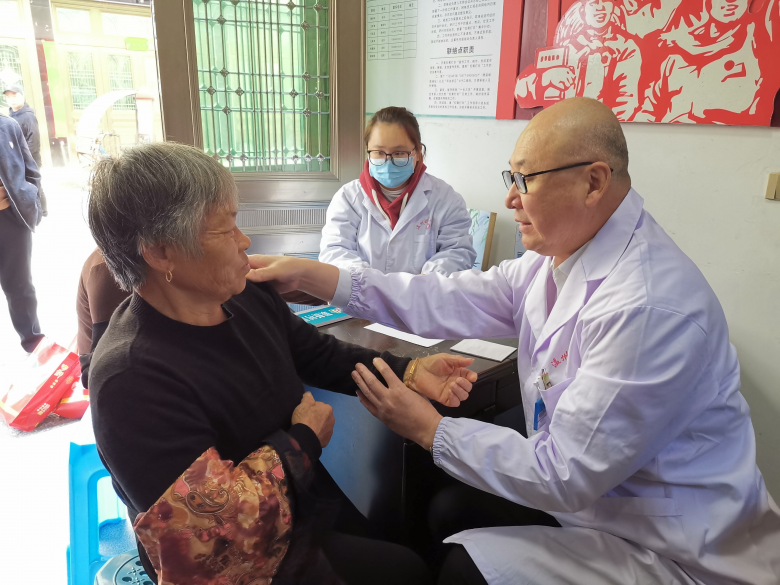 当天,温州曙光医院业务院长陈善亮为村民一一诊治并张贴膏药,护士唐丹给有需要的村民测量血压。