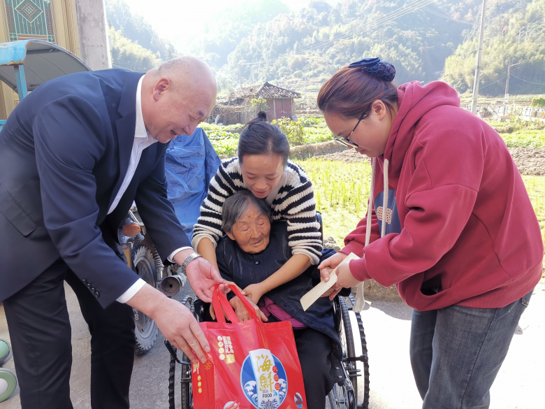 陈忠慈善工作室党员和珊溪镇党委副书记田雨欣等人化身志愿者,前往10名困难户家中慰问,为他们送去装有鱼干、虾皮等慰问品及慰问金的温都爱心包。