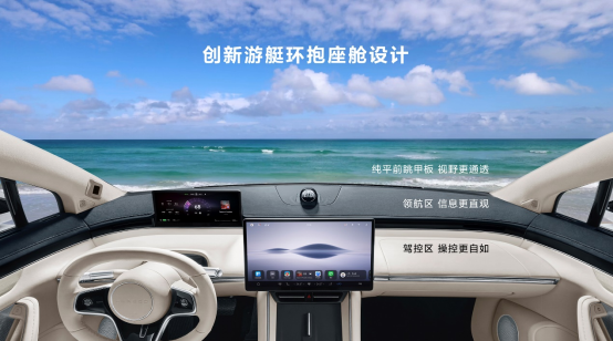 智界S7长宽高分别为4971*1963*1461mm,轴距为2950mm,在城市通勤恰到好处的车身尺寸下,机械空间最小化,乘坐空间最大化,把空间还给用户。车内采用创新游艇环抱座舱设计,通过运动主驾、尊享副驾女王空间和智享后排大空间的三分区设计,完美地兼顾了驾驶乐趣与舒适乘坐体验。