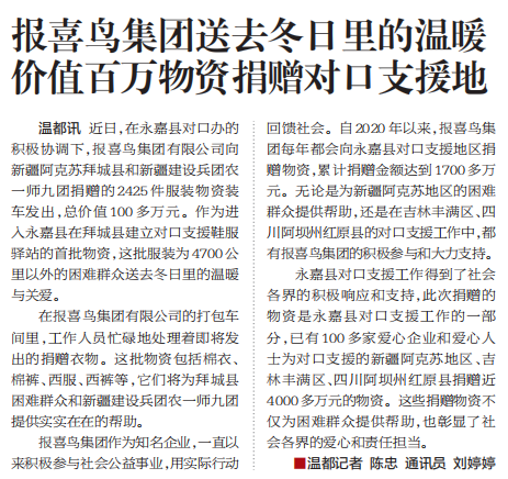 报喜鸟集团作为知名企业,一直以来积极参与社会公益事业,用实际行动回馈社会。自2020年以来,报喜鸟集团每年都会向永嘉县对口支援地区捐赠物资,累计捐赠金额达到1700多万元。无论是为新疆阿克苏地区的困难群众提供帮助,还是在吉林丰满区、四川阿坝州红原县的对口支援工作中,都有报喜鸟集团的积极参与和大力支持。