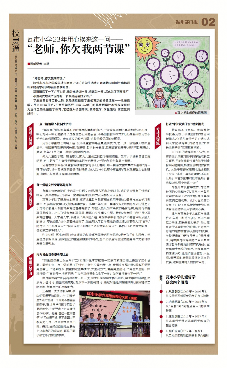 温州市瓦市小学儿童哲学能坚持23年并不断迭代创新,瓦市小学党委书记、校长吴孔裕表示,动力源泉在于儿童哲学的价值,它对学生思维的培养有着得天独厚的优势。学校提出的“爱智且爱人”课程理念,将中国传统哲学的仁爱思想与西方哲学的思维训练有机融合,在发展学生思维的同时,又提高学生的道德认知,让他们在价值观、人生观、世界观的启蒙阶段得到正向的发展,达到立德树人的根本目的。