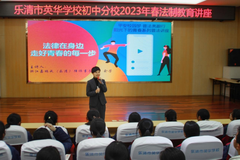 12月4日是第十个国家宪法日,英华学校举办 “弘扬宪法精神,争当守法公民”主题讲座,邀请浙江嘉瑞成律师事务所的陈竞律师为学生上宪法第一课,通过和陈律师的频繁互动,同学们对宪法有了深入的了解。10月12日,七年级普法教育讲座如期举行,赵云律师通过生动的案例,向同学们讲解了具有警示意义的法律常识。11月8日,学校开展消防安全演练活动,柳市消防中队李队长为全校师生讲解了火灾逃生的技巧。为筑牢校园反诈“防火墙”,该校组织学生集体观看反诈电影、布置反诈橱窗,在班主任工作群和家长群里推送反诈案例,警醒学生和家长提高防范意识。