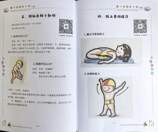 优化《我爱游泳》校本课程。学校基于“儿童立场”,根据游泳项目特色,面向全体学生开设了每周两节的“我爱游泳”普修课。普修课旨在锻炼身体,培养意志,学会自护自救,掌握生存技能,促进学生的身心健康全面发展。《我爱游泳》校本教材于2005年启动编制,2007年进一步完善投入使用。随着时代的发展,仅仅停留在文字描述和图片展示的教材显然已经跟不上时代的脚步,2023年,少泳校启动“滴水之约”定制型游泳教学校本教材的优化编写工作,通过充分的筹备、调研、座谈、研讨等一系列“头脑风暴”,明确校本教材的推进程序,逐步优化《我爱游泳》校本课程。这套新的校本教材更名为《泳娃爱游泳》,调整了教材目标和教学内容,优化了教学进度,并且加入了视频教学二维码,使学生和家长可以更加直观地根据教材指导调整自己的学习。