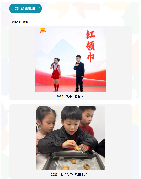 这份学生发展综合报告单上,用照片记录了学生这一学期以来的个人大事记,并对学生的品德表现、综合能力、学科素养等方面进行了评价。