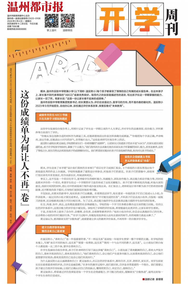 刚刚结束的期末,温州市实验中学附属小学(以下简称:温实附小)每个孩子都拿到了一份厚厚的专属成长报告单。在这本册子上,家长看不到代表等级的“ABCD”或者“优秀良好合格”。取而代之的全部是描述性的语言,写出孩子在这一学期掌握的能力,让家长一目了然。收到孩子成绩单后,有家长评价:“这是一份让家长卷不起来的成绩单。”