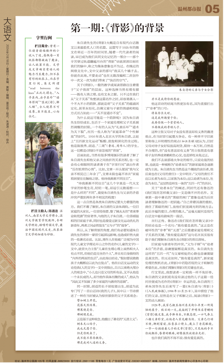 旧家庭与新青年的冲突,“父为子纲”与“幼者本位”的矛盾,毋庸置疑都是真实的。朱自清先生这样的“五四一代”与父辈相处的心路也毋庸置疑是真实的。但无论如何,“独有爱是真的”,新家庭伦理的契机在此,《背影》中若隐若现的父子和解的希望在此,而我们理解《背影》的关键也在此。