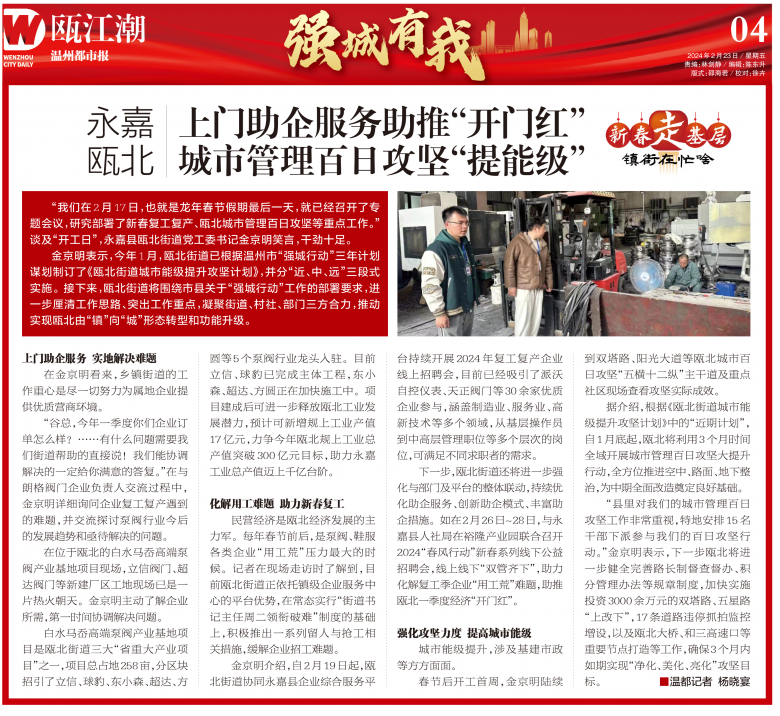 “我们在2月17日,也就是龙年春节假期最后一天,就已经召开了专题会议,研究部署了新春复工复产、瓯北城市管理百日攻坚等重点工作。”谈及“开工日”,永嘉县瓯北街道党工委书记金京明笑言,干劲十足。