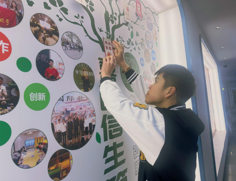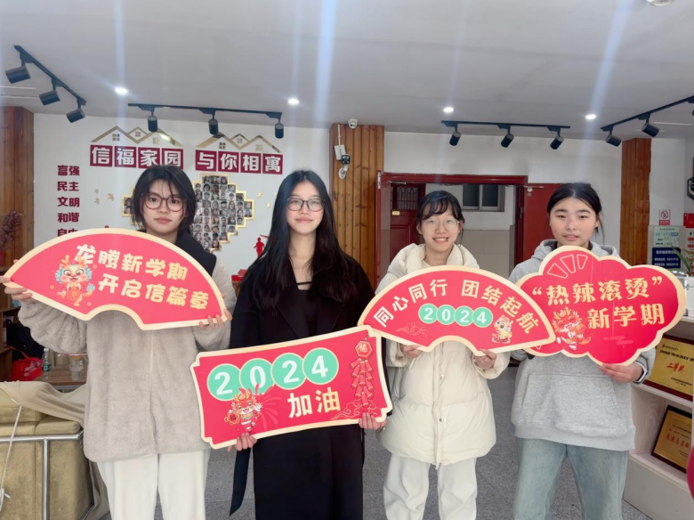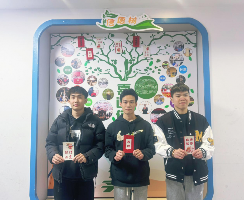 学院巧妙地融合传统文化元素与现代装饰,营造出温馨而庄重的暖心氛围。气球龙矗立于公寓各处,寓意着学子们在新学期将展翅高飞;信愿树上挂满了满载祝福的卡片,承载学院对学子们的美好祈愿;公寓门口的欢迎牌吸引不少学子驻足留下新学期的第一照。“踏入公寓,眼前的气球龙立即吸引了我,仿佛整个空间都充满了生机。” 智能控制23-2班的徐鑫楠分享道,“还有那信愿树上的龙年祝福卡片,每一张都写满了老师和学长学姐对我们的祝福和期待,让我感受到了信息大家庭的温暖。”