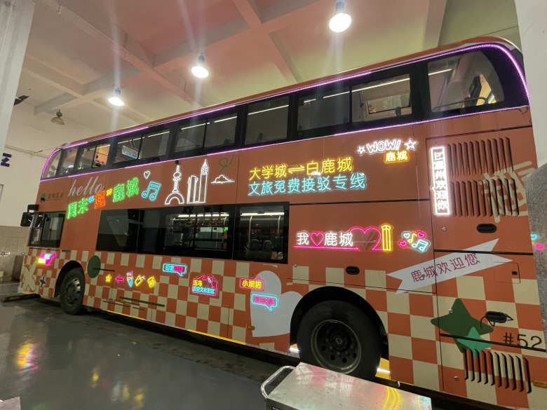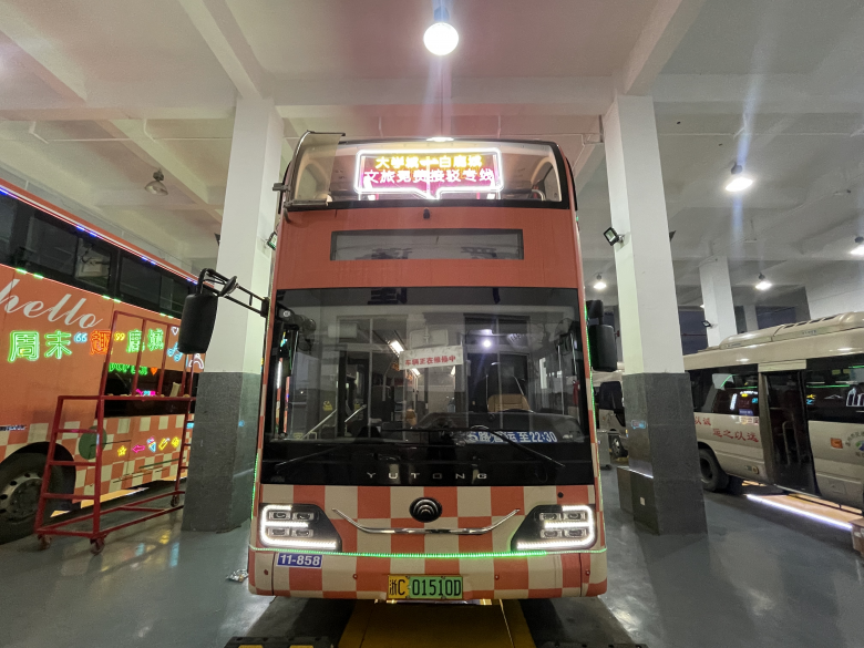 周末“趣”鹿城主题巴士为双层设计,采用橙与绿潮流配色,凸显青春靓丽色彩;霓虹灯形式的车身,融入音乐、美食、方言、夜游等温州夜消费元素,运行之后将成为“夜鹿城”的一道靓丽风景线。