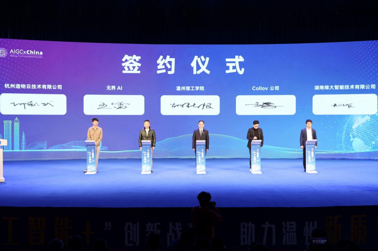 大会上,温州理工学院分别与中国联合网络通信有限公司温州市分公司、温州设计集团、浙江长城计算机系统有限公司、瑞明集团有限公司、帝杰曼科技股份有限公司、中国AIGC产业联盟、中国(温州)智能谷、浙江惠利玛互联网有限公司、无界AI、杭州造物云技术有限公司、维大智能技术有限公司、Collov 公司签订合作协议,实现人才培养、科研攻关、社会服务等多方面校企联动。