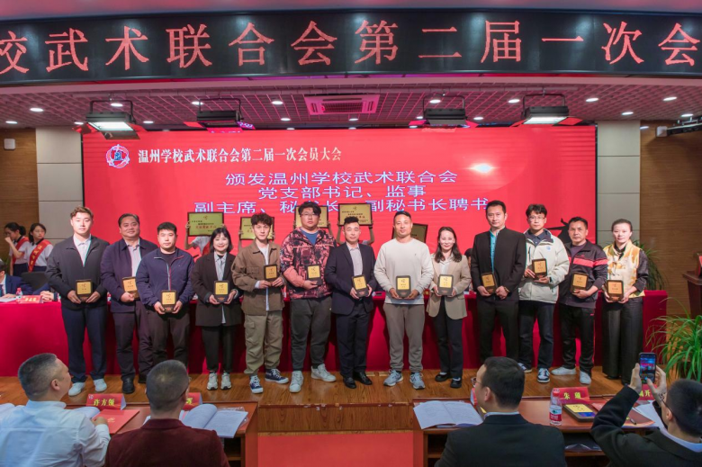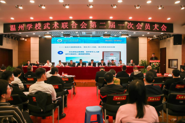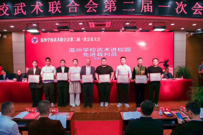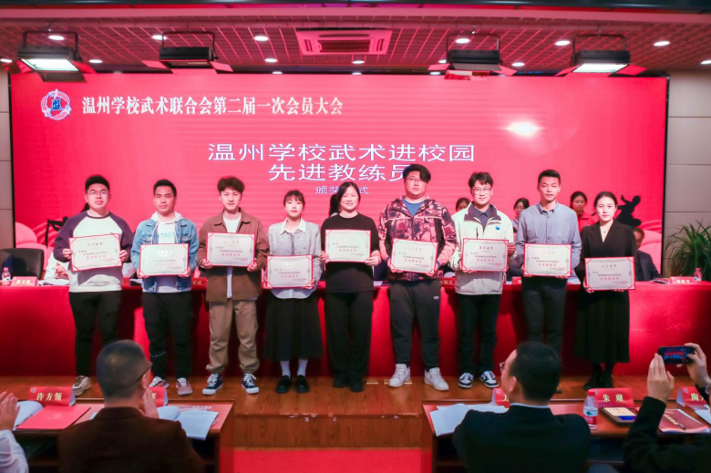 会上还进行了先进会员单位和个人表彰,龙湾中学、温州市第八中学、瑞安市外国语小学、温州市瓯越小学、乐清分联盟获突出贡献单位称号;温州市第八高级中学、温州市职业中等专业学校、温州市实验中学、温州市瓦市小学、温州市籀园小学、温州道尔顿小学、鹿城区瓯江小学、龙湾区永兴第一小学、苍南县飞林文武学校、苍南县灵溪镇第二小学、乐清市柳市镇第十六小学、乐清市知树幼儿园获武术进校园先进学校称号;温州剑源体育培训有限公司、习武者(温州)体育文化发展有限公司、温州搏克斯体育文化发展有限公司、洞头区海鱼儿武道馆、乐清市屹启体育发展有限公司、瑞安市创新武术培训中心、平阳县芳旭武术基地、平阳县武道健身俱乐部、龙港市华弘武术培训有限公司获武术进校园先进俱乐部称号。