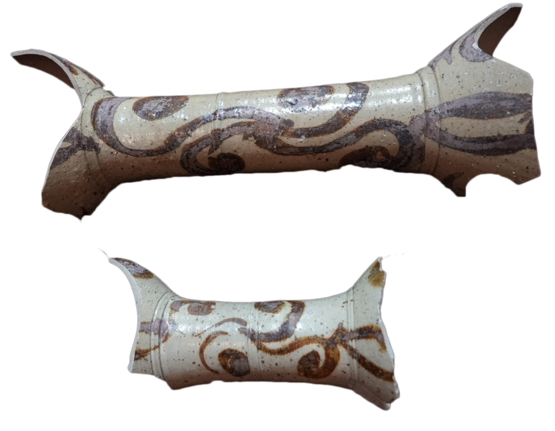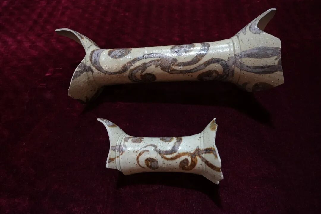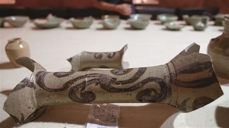 永嘉启灶窑址也曾出土有少量的腰鼓残片,均为乳浊厚釉,呈乳白色。而这次朔门古港出土的瓷腰鼓表面精细完整,上有褐彩绘、卷草纹,是温州第一次发现这么完整、纹饰精美的瓷腰鼓。温州瓯窑有长达1300多年的制瓷史,其中褐彩工艺是瓯窑最具特色的纹饰工艺之一。魏晋时期,瓯窑出现了点彩、条饰和褐彩书法等褐彩装饰手法。宋代已经能够熟练运用褐彩在青瓷上进行彩绘创作,线条更加自然随性。
