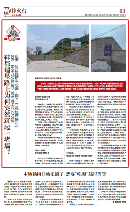 温都讯 “好好的马路上为什么突然建起一堵墙,直接把道路拦腰截断了!”5月9日,多位网友向温都全媒体(微信公众号:wd88868886)反映中国鞋都的瑞星路被封道,给周边居民出行造成很大不便。记者从鹿城区丰门街道办事处了解到,瑞星路并非市政道路,土地权属归当地一家国企,街道目前正同该企业协商,争取早日恢复道路通行。
