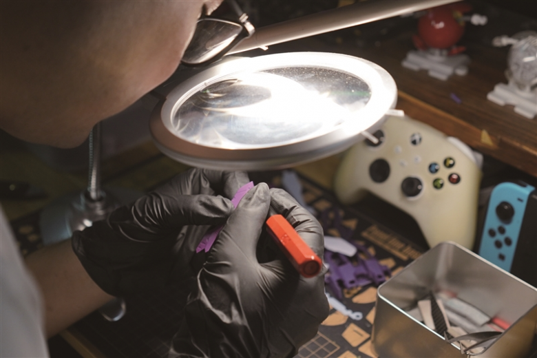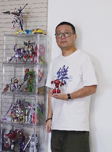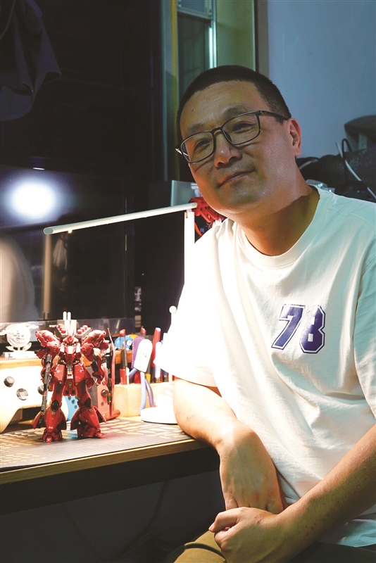 首次见到刘勇,觉得他比实际显年轻,T恤、寸头、宽松短裤,带着慵懒气质,却有着密集的语言输出。与记者聊天中,“E”人性格的他,毫不吝啬地表达自己对装搭高达的喜爱,“为高达机甲模型手办装搭上一个小零件或给机甲喷上绚丽的油漆,这过程本身就很治愈。”
