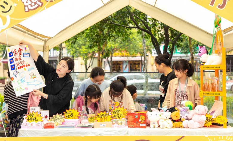 该市集活动此前向全社会公开召集摊主家庭,不少家庭带着孩子报名,孩子们现场化身“摊主”“掌柜”,拿出自己的闲置物品,或精心准备的商品,“不遗余力”助力公益。