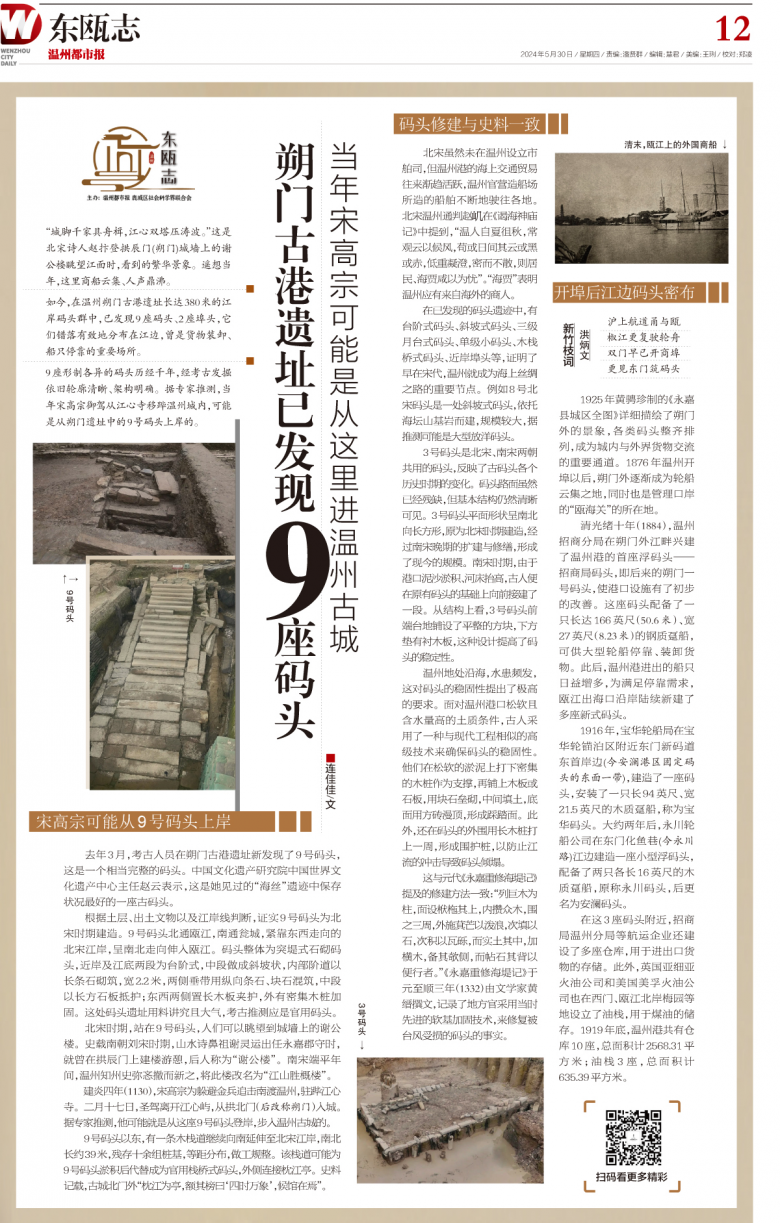 建炎四年(1130),宋高宗为躲避金兵追击南渡温州,驻跸江心寺。二月十七日,圣驾离开江心屿,从拱北门(后改称朔门)入城。据专家推测,他可能就是从这座9号码头登岸,步入温州古城的。