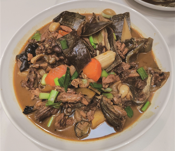 “甲鱼烧本地鸡”是至真饭店的特色家烧之一。来自丽水云和的稻田甲鱼和永嘉香鸡,两种山珍美品,碰撞出别有韵味的“花火”,汤汁浓郁,香气盈室。云和稻田甲鱼裙边胶质醇厚黏嘴,甲鱼肉细腻软糯最终化成弹牙细丝滑入胃中,“稻田甲鱼生长周期长,比普通甲鱼味道香浓,是家烧不可多得的好料。”徐智敏说。