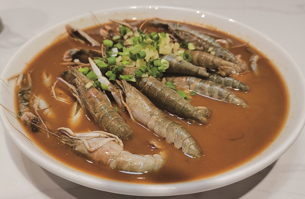 一盘青色醉虾上桌,虾螯一大一小吸引眼球,主理人介绍这盘生醉虾取材于有温州“斯干比”之称的“倒爬虾”(野生鼓虾),每年的10月份至来年3月份上市,在“倒爬虾”鲜活的状态下直接冰冻,解冻后生醉,口感更好。