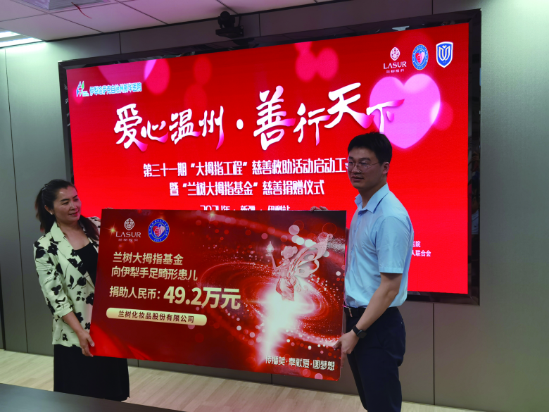 这次“大拇指工程”走进伊犁州费用由兰树化妆品股份有限公司捐赠。2019年3月,“大拇指慈善基金”在温州市慈善总会成立,兰树化妆品股份有限公司为“大拇指工程”捐资600万元(每年200万元)。