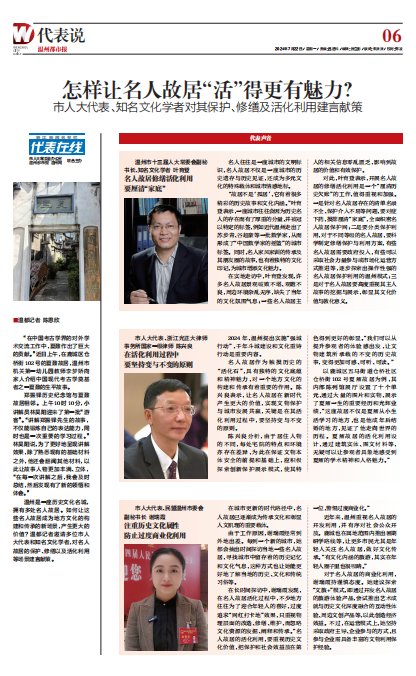 温州是一座历史文化名城,拥有多处名人故居。如何让这些名人故居成为地方文化的构建和传承的新场景,产生更大的价值?温都记者邀请多位市人大代表和知名文化学者,对名人故居的保护、修缮以及活化利用等场景建言献策。