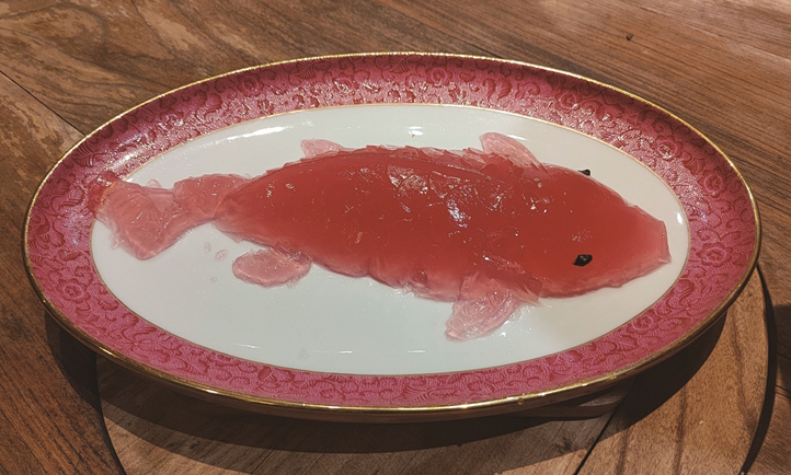 烹饪方法:将20克石莲子倒食用袋中清洗干净,然后取纯净水六升倒器皿中,把石莲子在器皿中揉搓,10分钟后胶质出来,有白沫时证明出胶完毕。然后取一片钙片用水溶化倒果汁中搅拌均匀,20分钟后自然结冻,装盘时用枸杞子点缀。