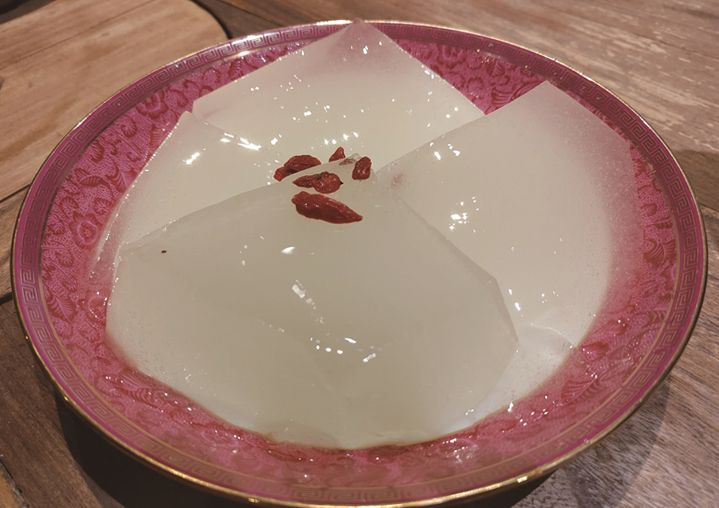 烹饪方法:将40克海石花倒锅中,加水8升,放甜叶草三片,倒白醋一勺和姜片,烧开后慢火煮20分钟左右,把水煮成黏性时用食用袋过滤。30分钟后自然结冻,装盘时放枸杞子点缀。