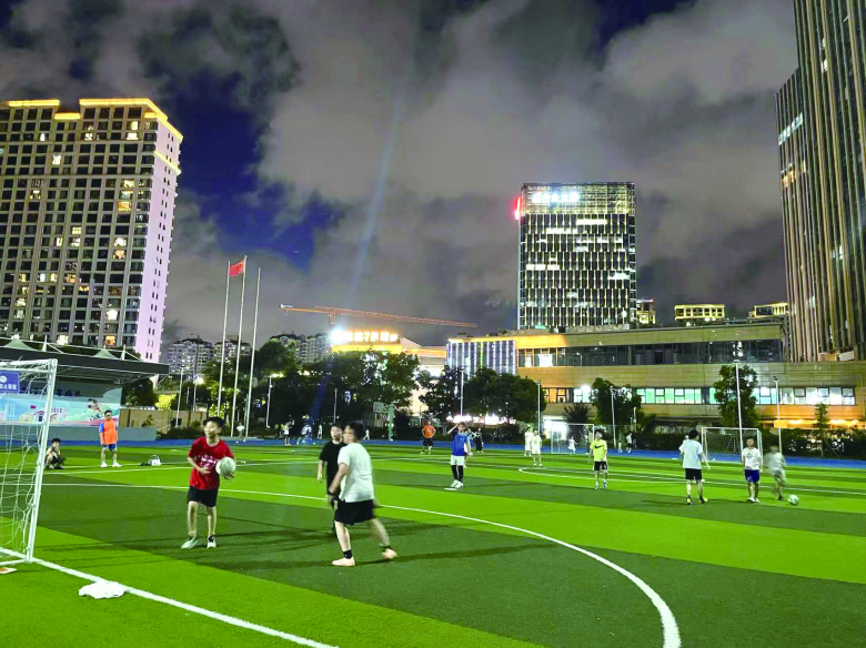 晚上7点30分左右,操场热闹起来了。住在周边的20多名男孩自发组成了几支足球队,在球场上驰骋。一名爸爸说,儿子已经连着进校锻炼三四天了,“他踢足球,我跑步,比在家玩游戏好多了。”