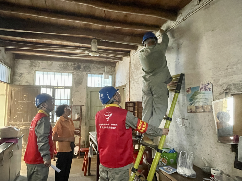 服务队队员们利落地架好梯子,爬上去仔细检查起了灯泡接线,确认是接线不牢导致灯泡不亮。他们当即帮助徐奶奶重新接好了灯泡的线路,还耐心地将裸露的电线进行绝缘包扎。