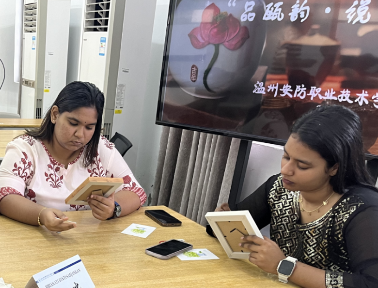 活动现场,董若慧精心选取了具有中国文化美好寓意的“柿事如意”和“平安喜乐”主题瓯塑画框制作内容,深深地吸引了留学生们的眼光。董老师在传授技艺的同时分享了瓯塑背后的历史故事与文化内涵。留学生们从上底胶、堆塑、调色到落款、上漆,深刻感受到中国传统文化的智慧与匠心。他们脸上洋溢着对中华文化的好奇与探索,手执工具,认真聆听讲解,每一次尝试都伴随着欢声笑语。