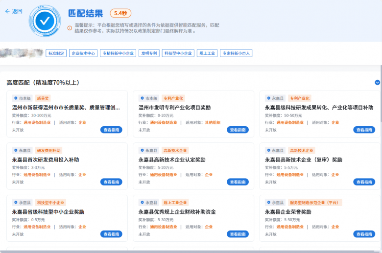 记者在计算器内输入一家温企名字,不到6秒,通过自动识别的“标准制定”“企业技术中心”“专精特新中心企业”“规上企业”等多个企业标签,显示出了高度匹配(70%)的政策21项作为参考。