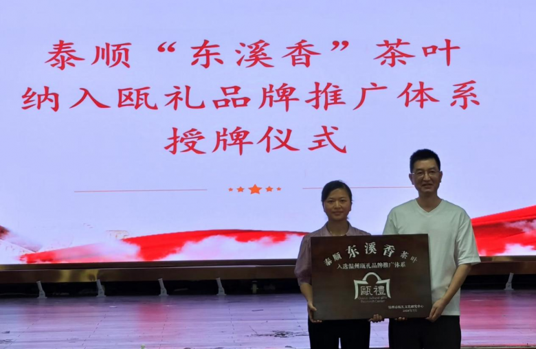 当天,活动现场还举行了授牌仪式。温州市政协委员、温州市瓯礼文化研究中心主任南航向东溪乡党委副书记、乡长范晶晶授“泰顺东溪香茶叶纳入瓯礼品牌推广体系”牌匾、证书。