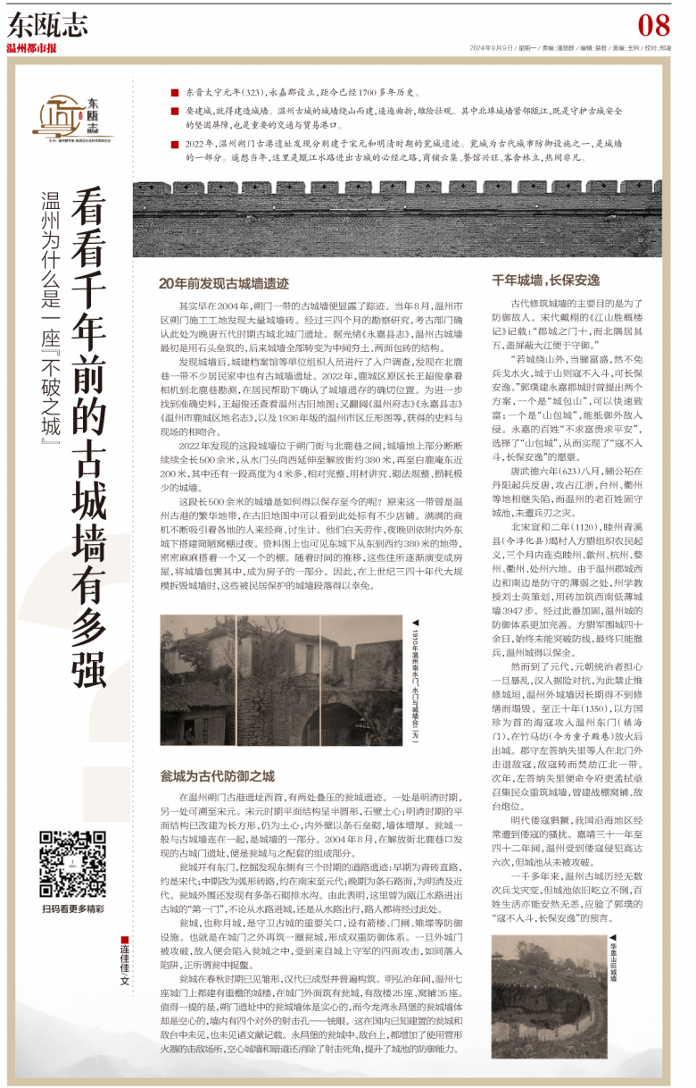 ■要建城,就得建造城墙。温州古城的城墙绕山而建,逶迤曲折,雄险壮观。其中北埠城墙紧邻瓯江,既是守护古城安全的坚固屏障,也是重要的交通与贸易港口。