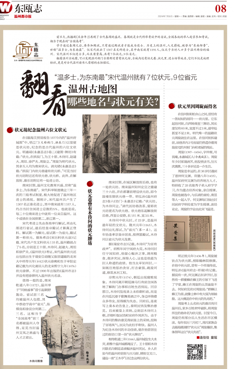翻看温州古地图,可以发现温州朔门古港附近曾有状元坊,古城内还有状元巷、状元里、进士坊等地名,它们不仅是地理标识,更是对古代温州读书人荣耀的永恒铭记。