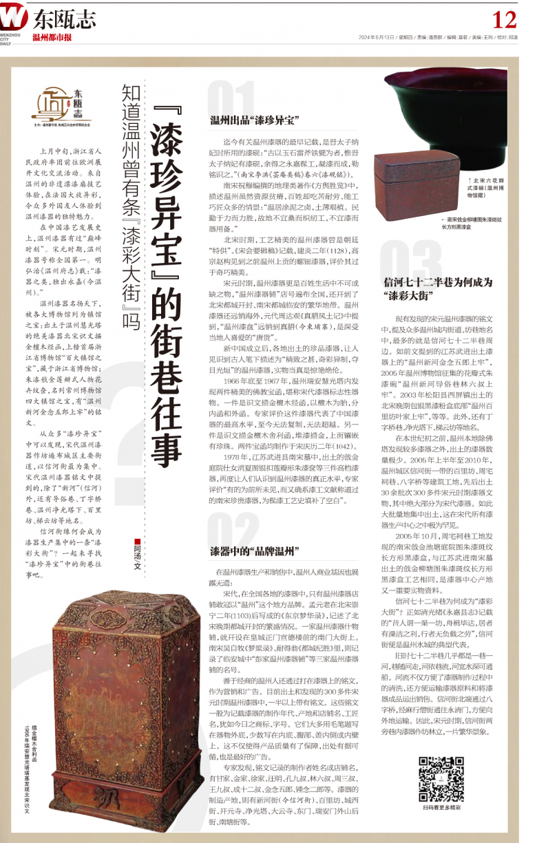 宋元时期,温州漆器更是百姓生活中不可或缺之物,“温州漆器铺”店号遍布全国,还开到了北宋都城开封、南宋都城临安的繁华地带。温州漆器还远销海外,元代周达观《真腊风土记》中提到,“温州漆盘”远销到真腊(今柬埔寨),是深受当地人喜爱的“唐货”。