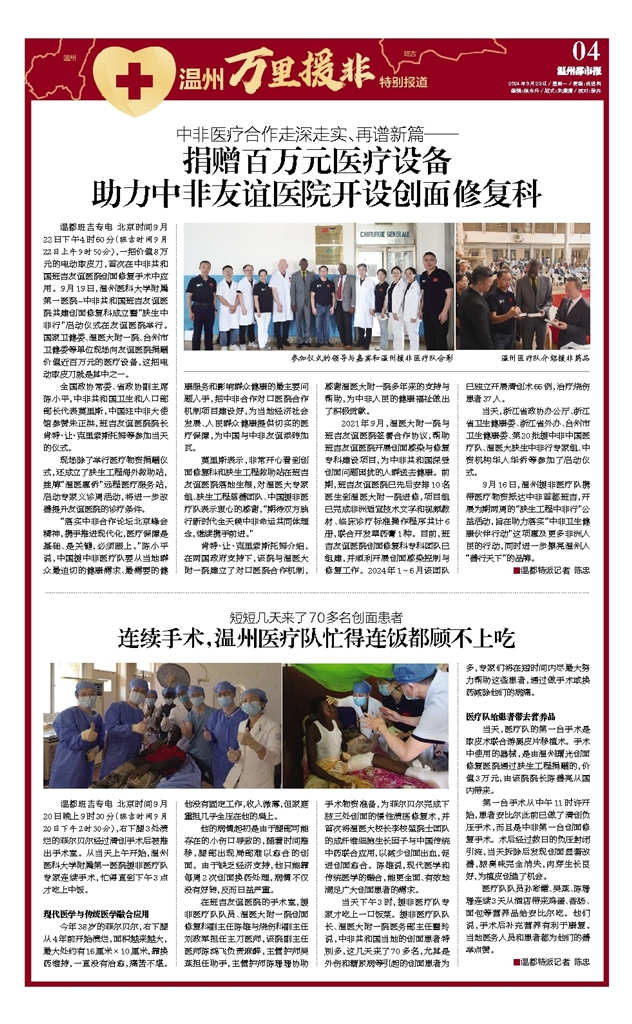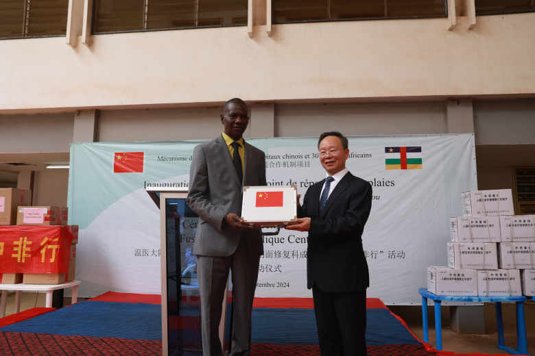 温都中非共和国班吉专电 9月19日上午,温医大附一院一一中非共和国班吉友谊医院共建创面修复科成立暨“肤生中非行"启动仪式在友谊医院举行。当天,创面修复科在班吉友谊医院开诊,国家卫生健康委、温州医科大学附属第一医院、台州市卫生健康委等单位向友谊医院捐赠了价值近百万元的医疗设备和医疗应急相关用品。全国政协常委、省政协副主席陈小平表示,时值中非合作论坛北京峰会成功举行、中国与中非共和国建交60周年,很高兴在班吉友谊医院参加中非合作对口医院合作机制项目的相关活动,共同见证中非医疗合作走深走实、再谱新篇。中非共和国卫生和人口部部长代表莫里斯、中国驻中非大使馆参赞朱正洪等参加仪式。