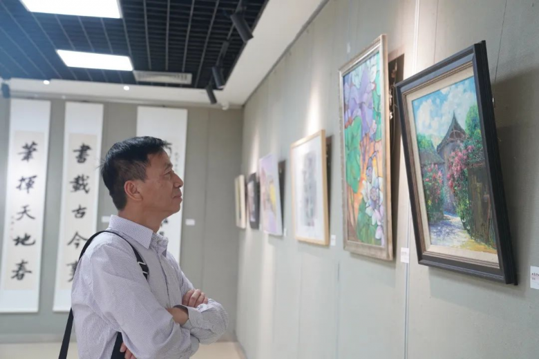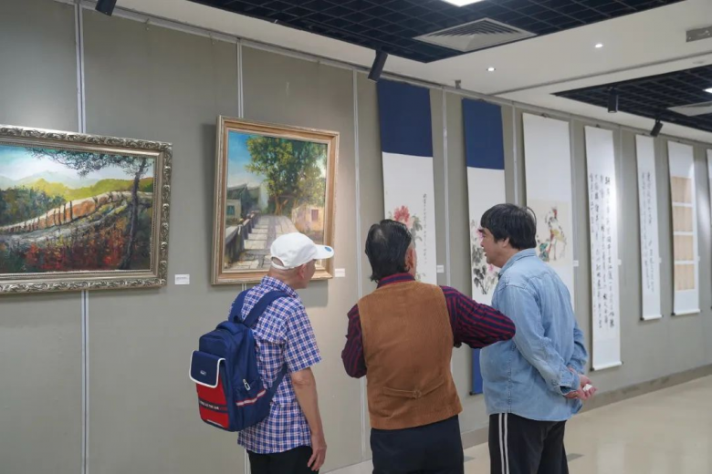 此次展览有幸征集到温州三中众多杰出校友的作品,共展出 38 位师生校友精心创作的 58幅作品,包含国画、油画、书法,篆刻、木雕、根雕等丰富题材和多样风格的艺术作品。书法作品或气势磅礴,或细腻婉转,笔锋遒劲,展现了作者深厚的书法功力与独特的艺术风格;绘画作品更是丰富多样,山水画气韵悠长,花鸟画生动鲜活,人物画细致入微,每一笔都展现出非凡的艺术造诣。每一件作品都凝聚了作者的匠心与智慧,吸引了众多观众驻足观赏。展会厅现场气氛热烈,时常响起赞美之声,浓厚的文化氛围在整个展览空间中弥漫开来。
