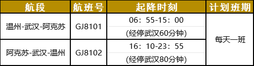该航线由空客A320机型执飞,每日执行一班。去程航班号为GJ8101,06:55从温州龙湾国际机场起飞,08:50抵达武汉天河国际机场,在武汉天河国际机场仅经停1小时,15:00抵达阿克苏红旗坡机场。返程航班号为GJ8102,16:10从阿克苏红旗坡机场起飞,23:55抵达温州龙湾国际机场。
