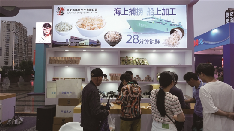 “这个华盛的虾皮,我以前买过,至少要35元一袋,今天展会现场只要30元一袋,赶紧来买一点。”在瑞安馆逛的吴女士,一手拎着刚买的虾皮,一手拿着手机叫亲朋好友来逛展。吴女士说,她家大人小孩都爱吃虾皮,之前也买过其他品牌的虾皮,但自从买了华盛水产的虾皮,再没更换过。