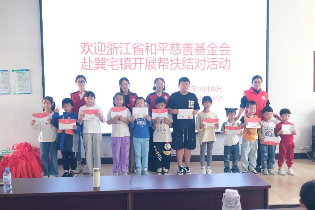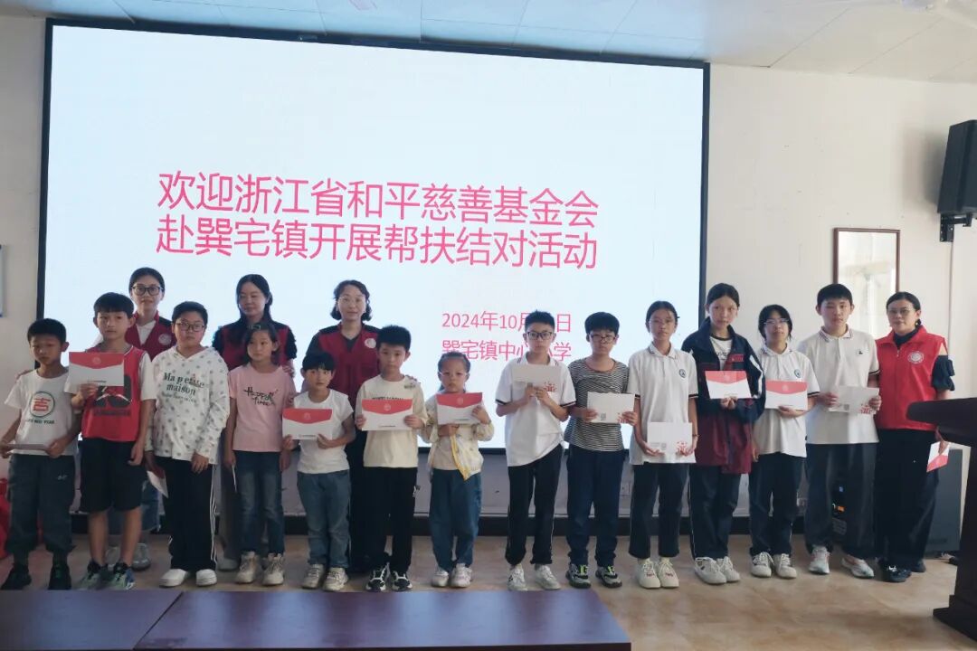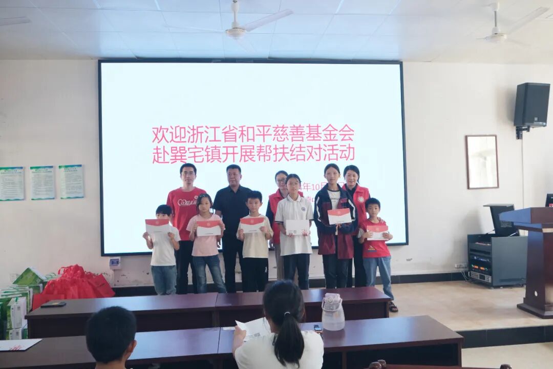 10月18日,浙江省和平慈善基金会赴巽宅镇中心小学开展助学帮扶结对活动,向38名学生发放助学金、奖励金81000元和牛奶等慰问品,表达对学生们深切关怀和殷切期望。