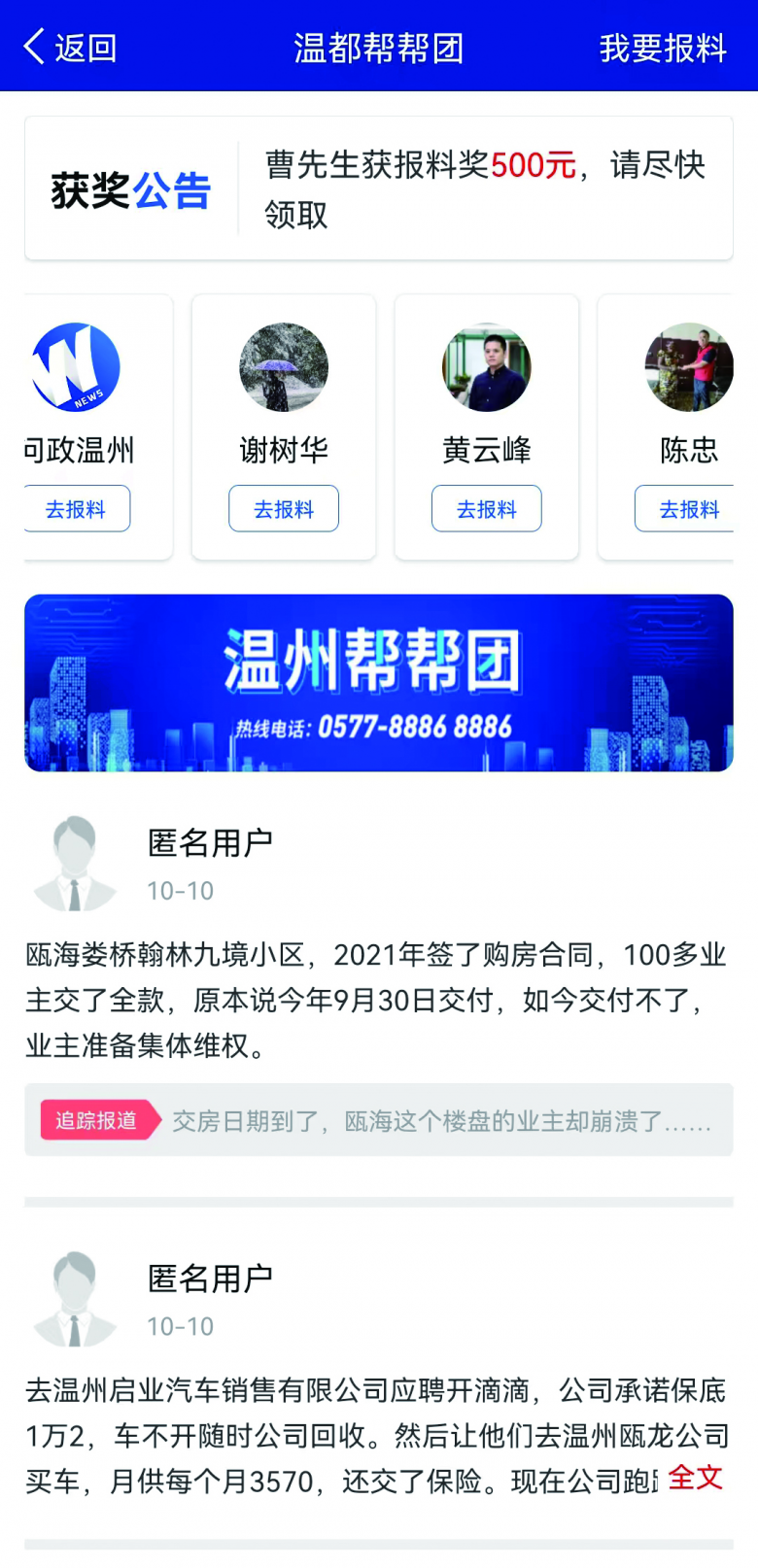 只要你打开“掌上温州”新闻客户端,在“温都帮帮团”频道发布求助或报料信息,帮办互动便能“一键即达”,在线为你答疑解惑。你还可以拨打温都新闻热线88868886,提供各类新闻线索,线索一经采用,最高奖励2000元。