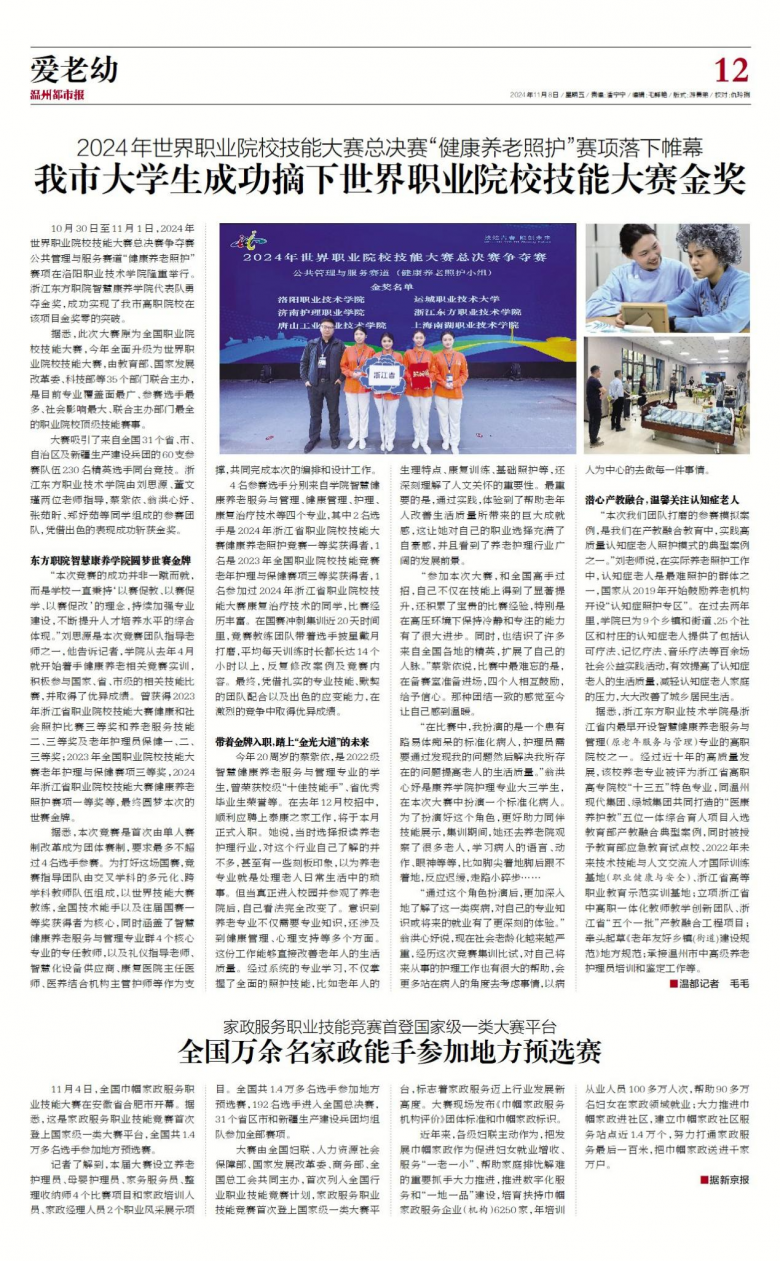 “本次竞赛的成功并非一蹴而就,而是学校一直秉持‘以赛促教、以赛促学、以赛促改’的理念,持续加强专业建设,不断提升人才培养水平的综合体现。”刘思源是本次竞赛团队指导老师之一,他告诉记者,学院从去年4月就开始着手健康养老相关竞赛实训,积极参与国家、省、市级的相关技能比赛,并取得了优异成绩。曾获得2023年浙江省职业院校技能大赛健康和社会照护比赛三等奖和养老服务技能二、三等奖及老年护理员保健一、二、三等奖;2023年全国职业院校技能大赛老年护理与保健赛项三等奖,2024年浙江省职业院校技能大赛健康养老照护赛项一等奖等,最终圆梦本次的世赛金牌。