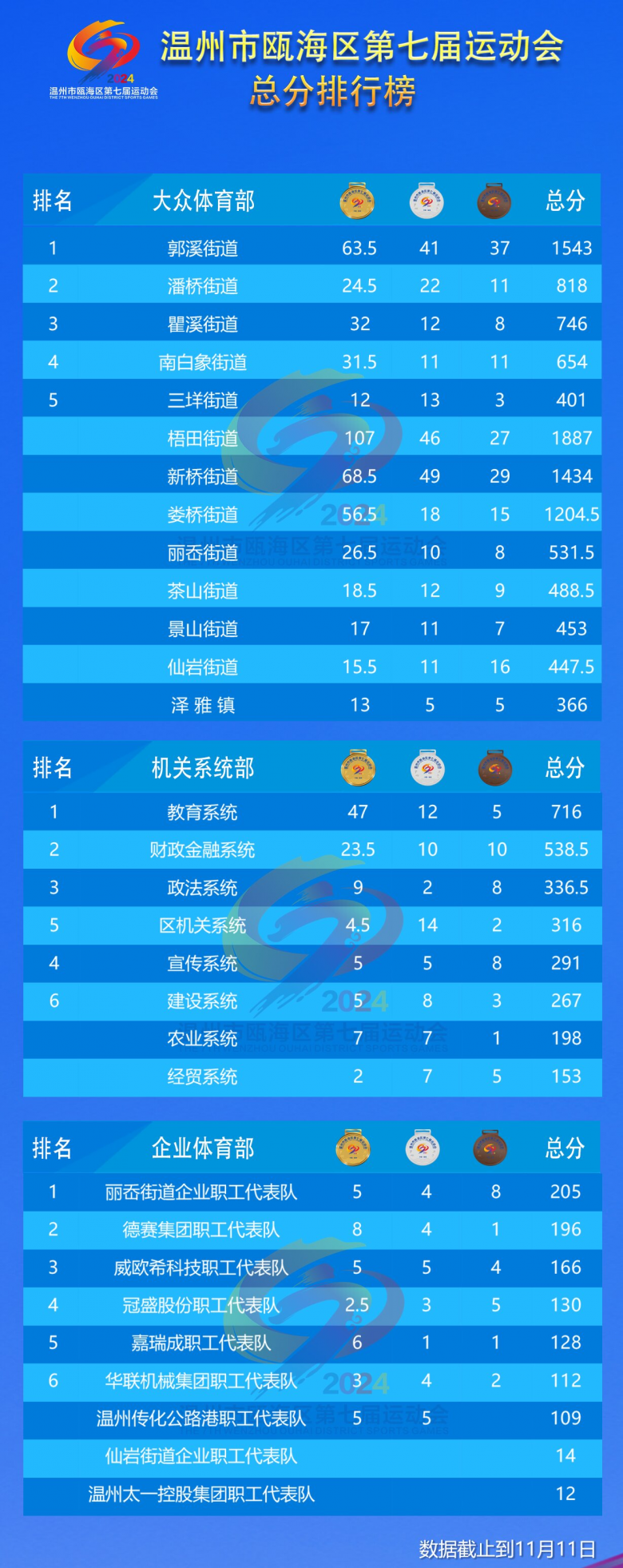 11月11日下午,随着田径项目赛事在温州科技职业学院体育场的结束,历时半年多的2024年温州市瓯海区第七届运动会圆满落幕。