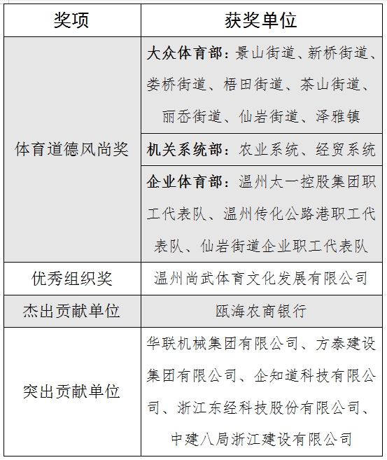 作为“中国龙舟文化之乡”,瓯海区曾成功承办了杭州亚运会龙舟赛事,龙舟运动群众基础深厚。本次运动会也首次新增了龙舟项目,进一步展现了瓯海龙舟文化的魅力,同时也丰富了市民群众的体育活动。另外,除青少年组的足球、羽毛球、跆拳道、乒乓球、排球、篮球、游泳、田径等8个项目为纯竞技项目外,其他组别均设置了如棋类、登山、广场舞、广播操等一批群众喜闻乐见、时尚休闲的项目。