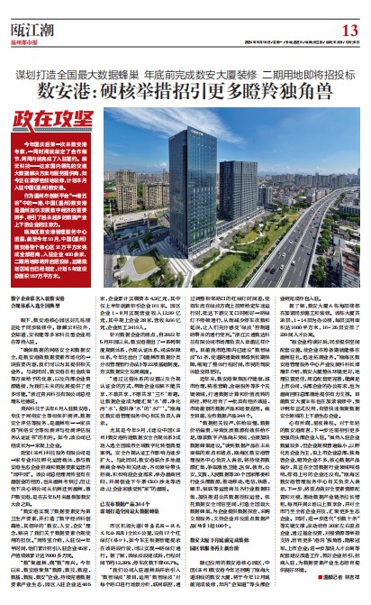 为吸引更多新质生产力企业和人才近悦远来,除已投用的数安港核心园区,中国(温州)数安港今年还回购了瓯海大道沿线的数安大厦,该大厦将于今年12月底前完成装修,年内预计“企知道”等头部企业将完成入驻。
